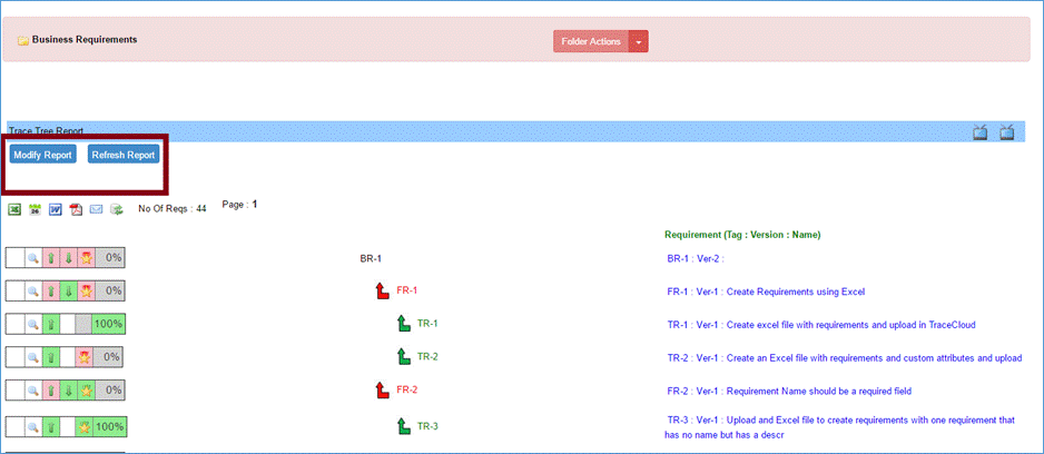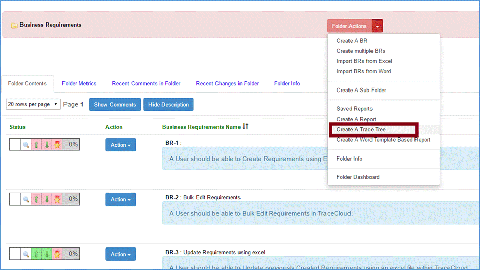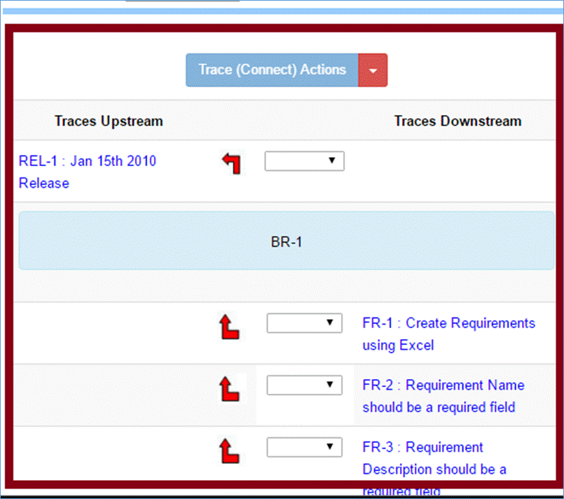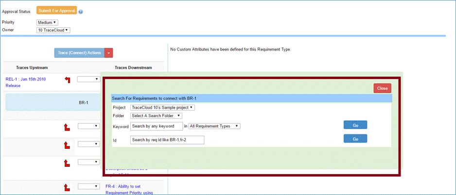 On the Requirement Details page, click on the “Trace Actions” button and hit “Create Traces.” Suggestions come up as information is entered.