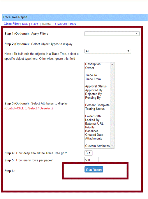 Enter the report’s requirements and click “Run Report” to view the trace tree.